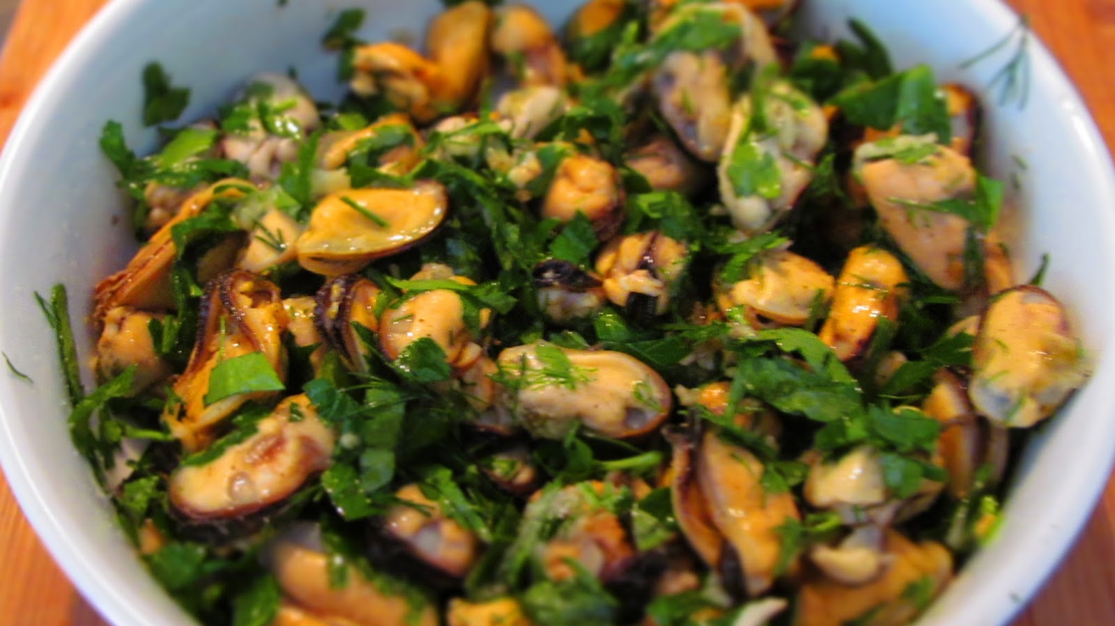 - В една купа се слага ситно нарязаният копър, магданозът, пасираният стар чесън или ситно нарязаният пресен чесън, черен пипер, сол на вкус, сокът от лимона, виното, олиото. Всички съставки се разбъркват хубаво и тогава се добавят мидите. Отново разбърквате и оставяте в хладилника да престоят, най-малко 30 мин. Колкото повече престоят, толкова повече поемат от съставките и са по-вкусни.