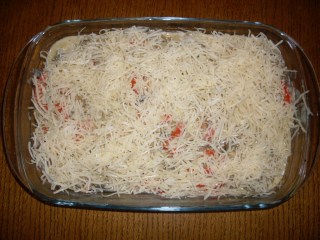 Тавичката се слага във фурната и се пече на 200 градуса около 30 минути