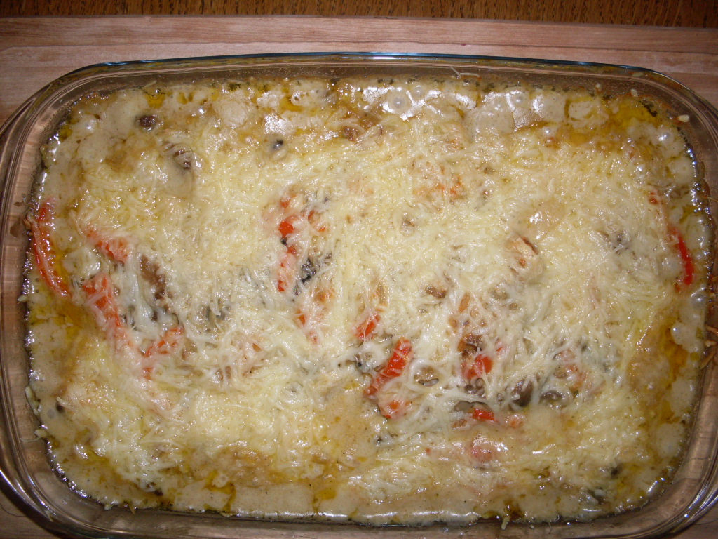 - Котлетите се подреждат в подходяща тавичка и се заливат с така готовата смес от чушки, гъби и сметана. Най-отгоре се поръсват с настъргания кашкавал.