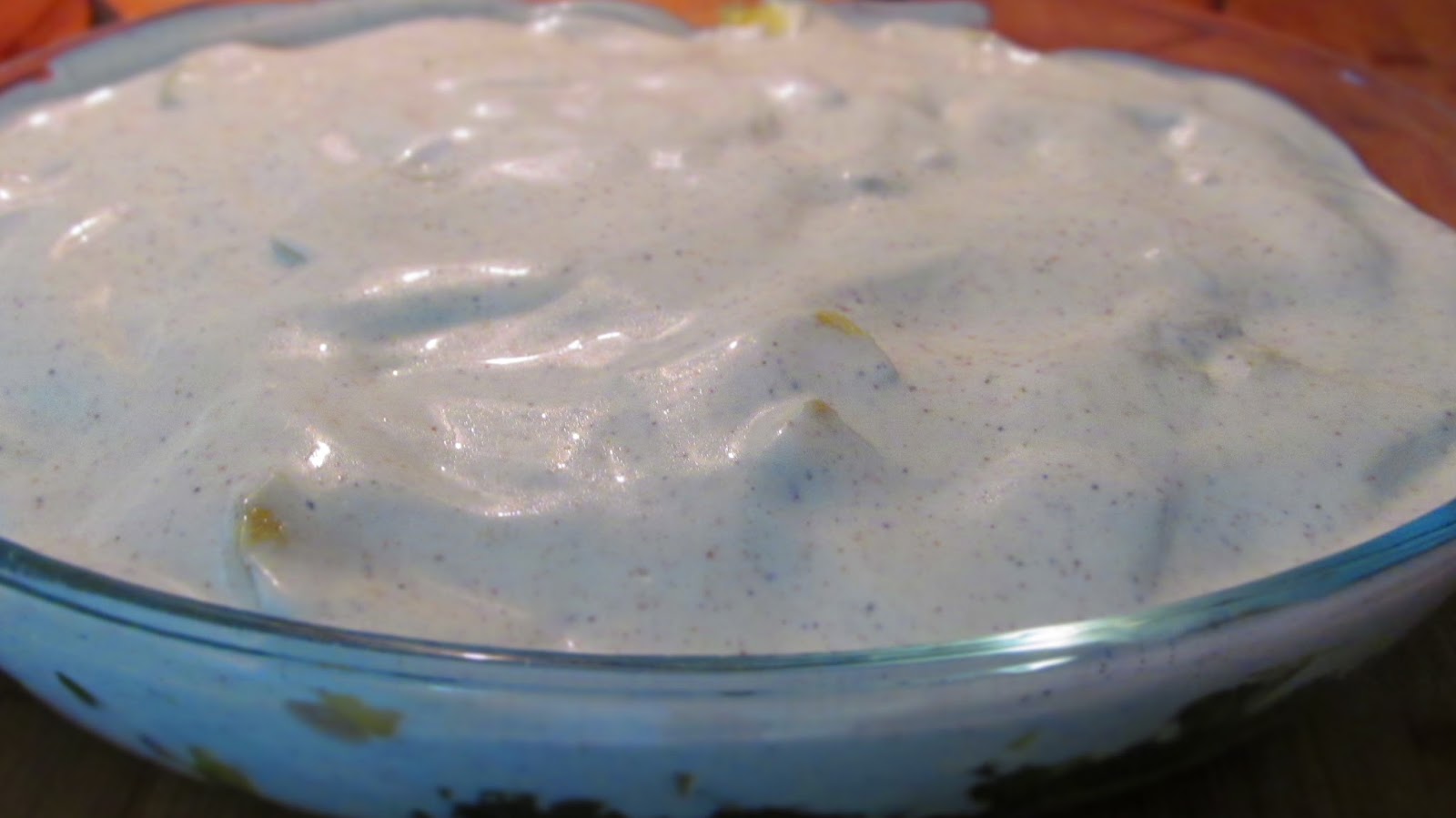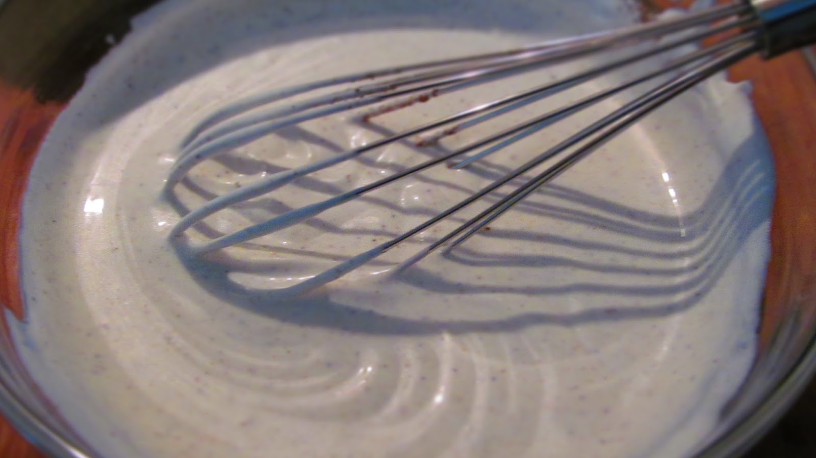 - Разбивам леко сметаната с 3 с. л. олио. Подправя се с черен пипер и сол.