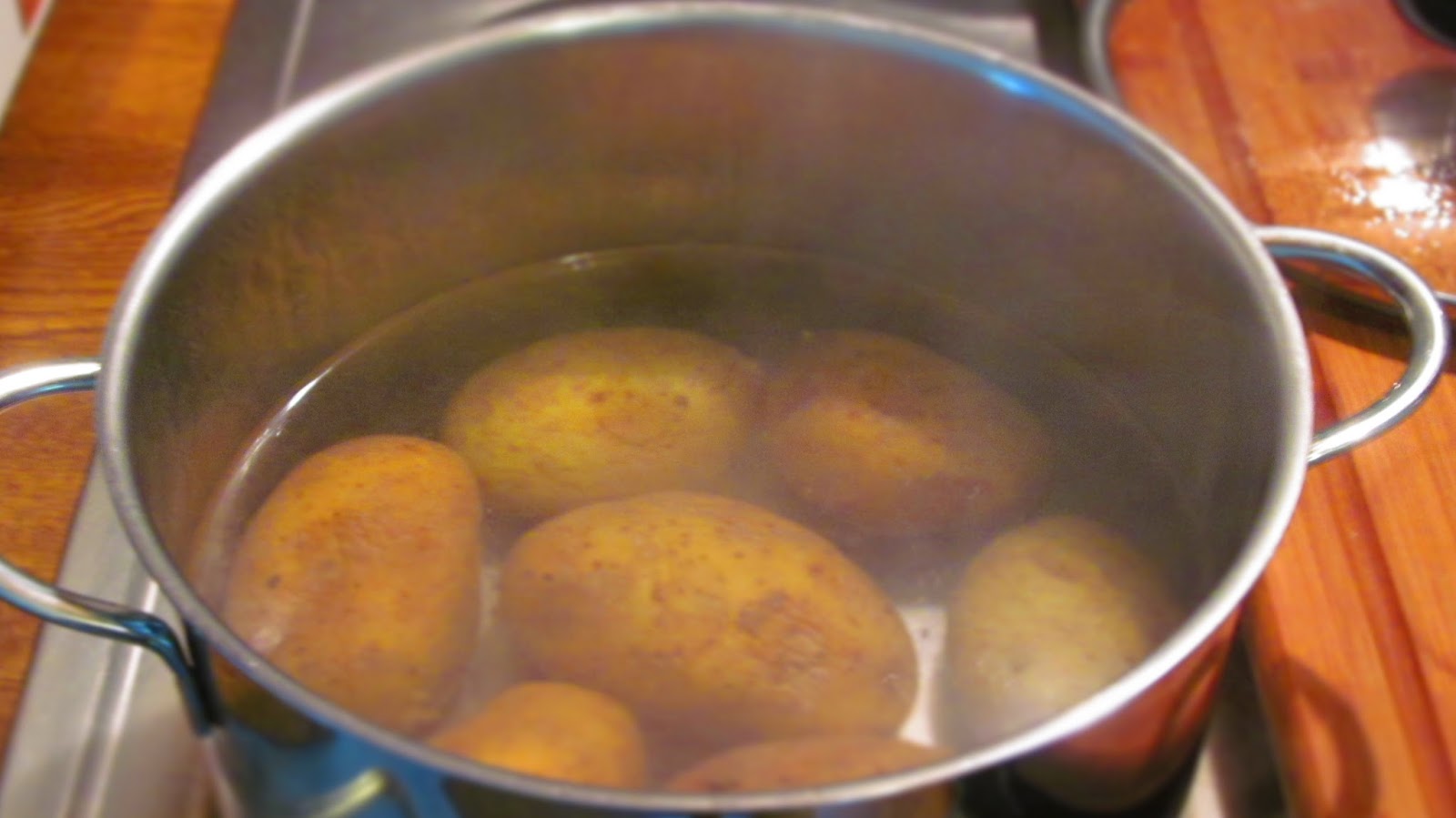 - Картофите се измиват и се сваряват с обелките във вода, за около 20 мин.