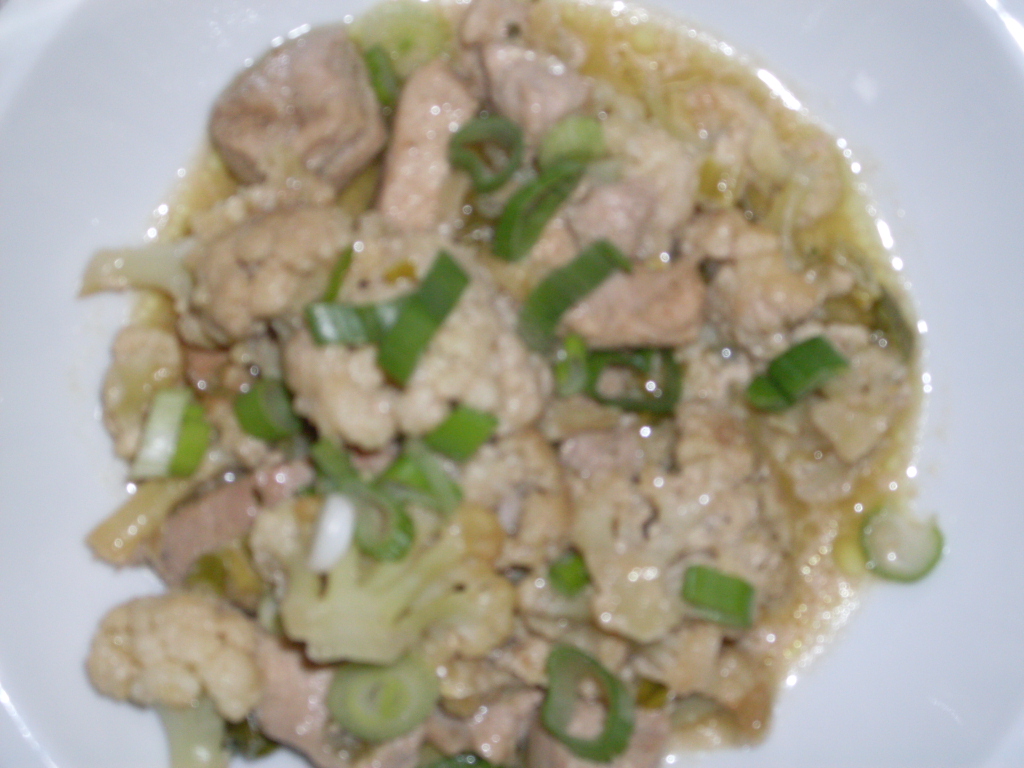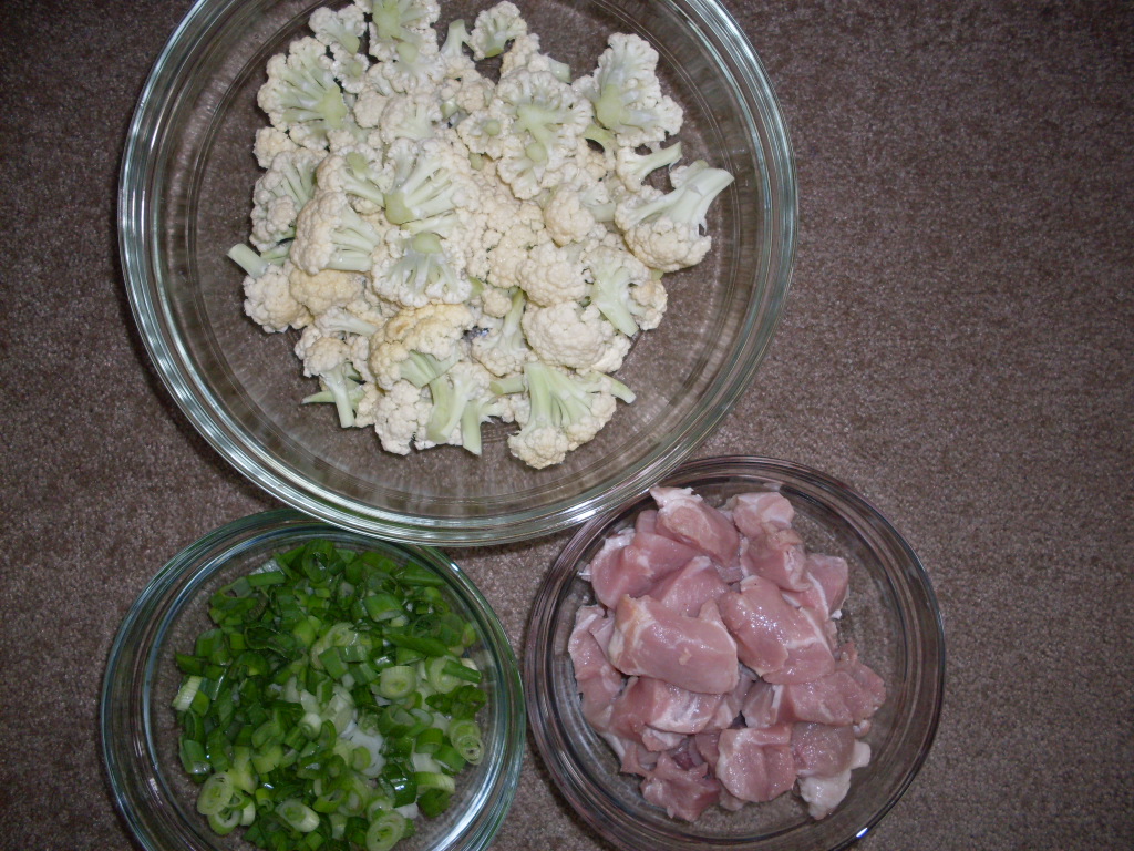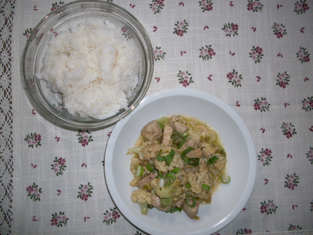 - Сервирам карфиола със свинско месо, поръсен със ситно нарязан зелен лук и сварен ориз като гарнитура.