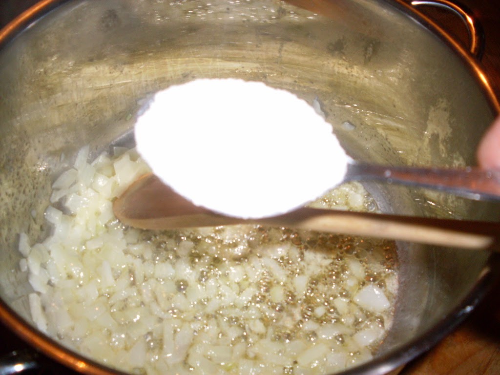 - Добавям брашното и запържвам за около 1 мин. Непрекъснато бъркам, за да не изгори брашното.