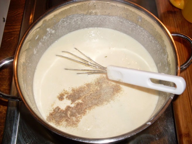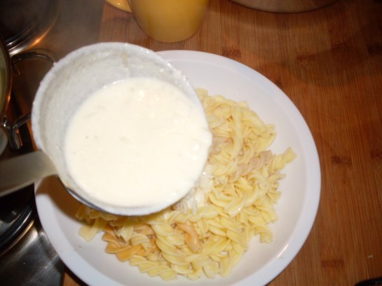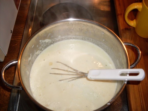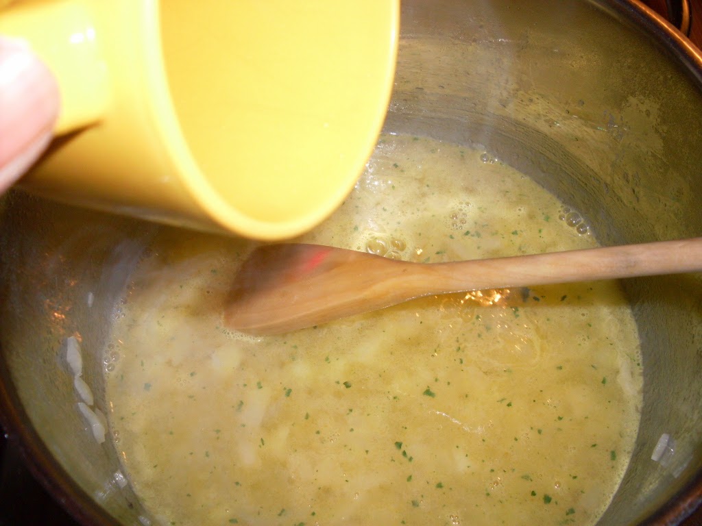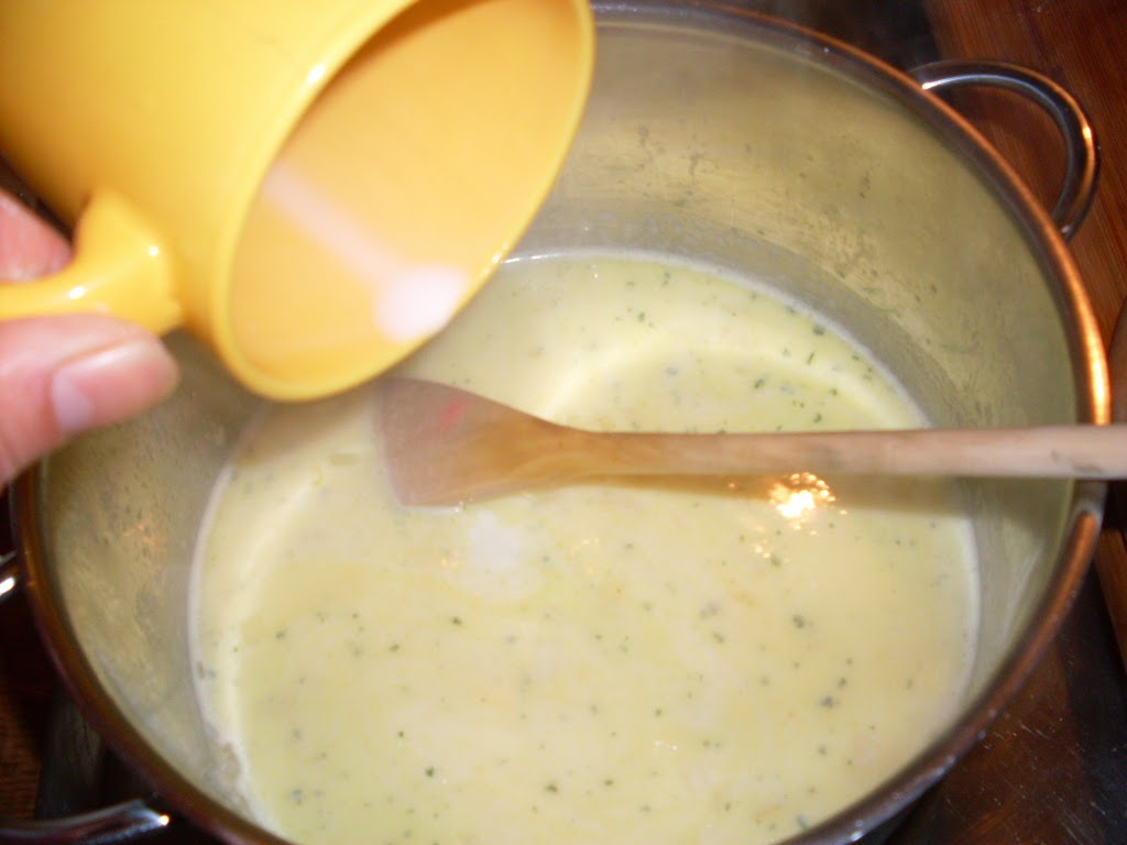 - Заливам с гореща вода като разтворих бульона в нея, добавям прясното мляко, сметната и като продължавам да бъркам с тел за разбиване на белтъци.