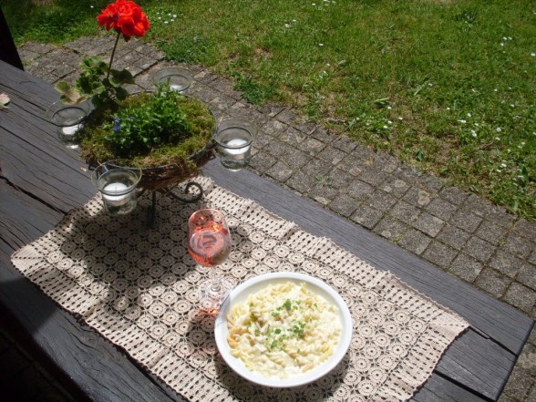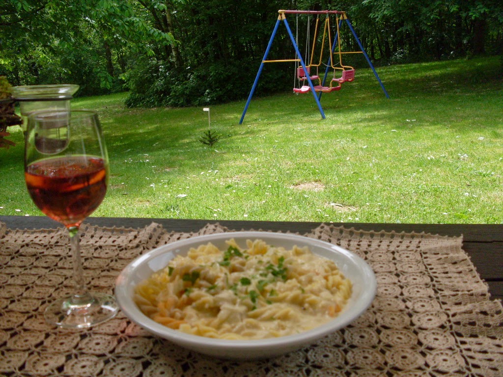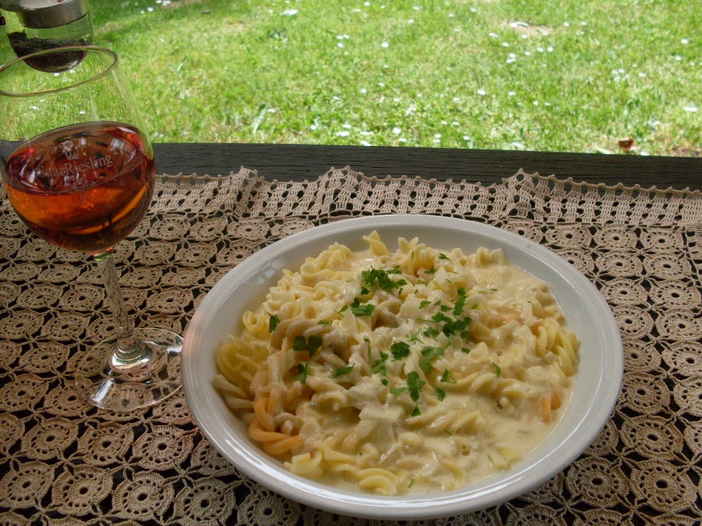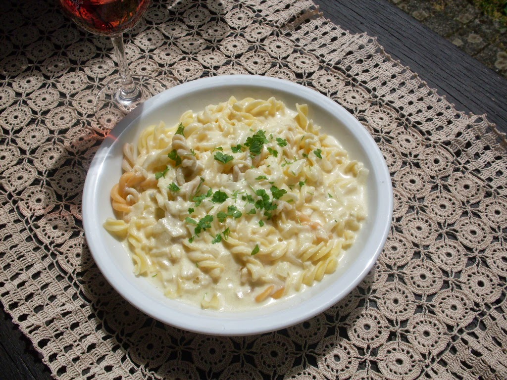 Днес сварих трицветни, спираловидни, къси макарони. Залях ги със соса, който беше с плътността на гъста картофена крем супа. Поръсих със ситно нарязан пресен магданоз и сервирах с чаша розе!