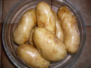 - Измивам много хубаво картофите с обелките /когато са пресни се консумират с обелките/ и ги сварявам за 20 мин. в подходяща тенджера.