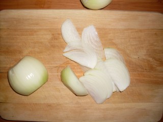 - Винаги започвам от лука. Обелвам нарязвам 1 кг лук на лентички. Това става като го разрежа на половина, обърна половинката върху отрязаната част и отново режа на тънки филийки. Така се получават лентичките. Това е и най-бавната и ревлива част от приготвянето на моя „Лучник“