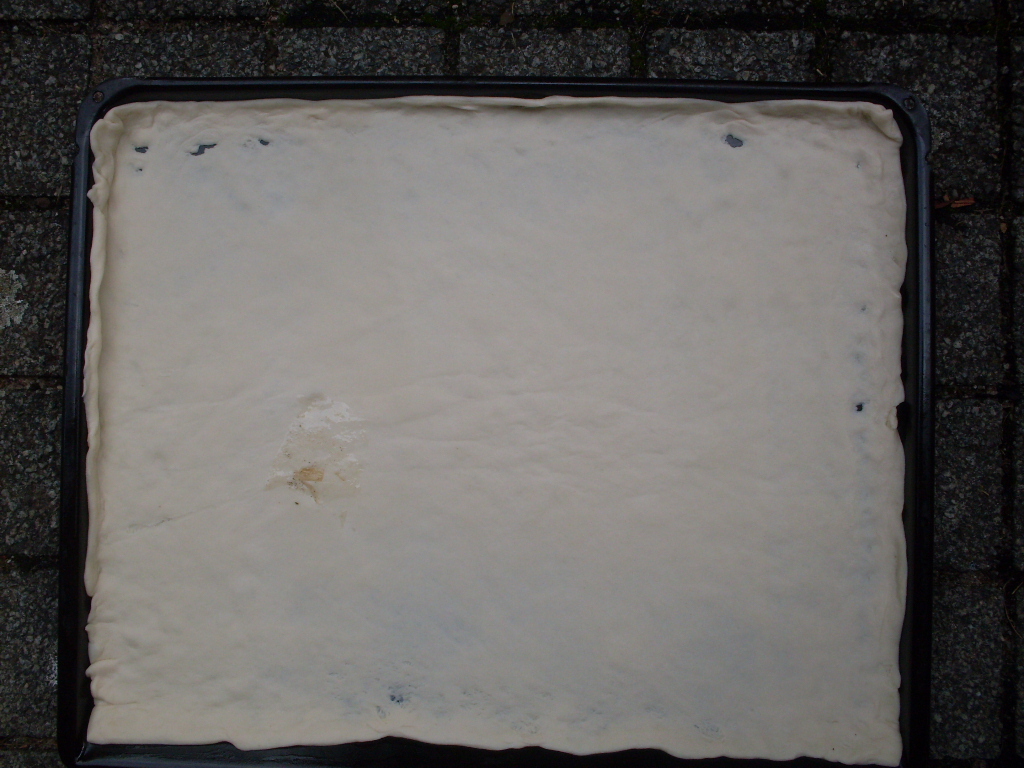 - През това време си подготвям тавичката, която е с размера на фурната и не е нужно да е дълбока. Намазвам обилно с останалото олио и разстилам тестото по цялата тава, като се старая съвсем малко да отива и по стените на тавичката. Дебелината на тестото е около 5 мм, когато се разстеле. И почти 1 см е височината на тестото, което разстилам по стените на тавичката.