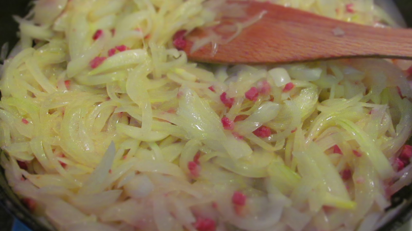 - Когато поомекне лукът, добавям парченцата бекон или пушени гърди.