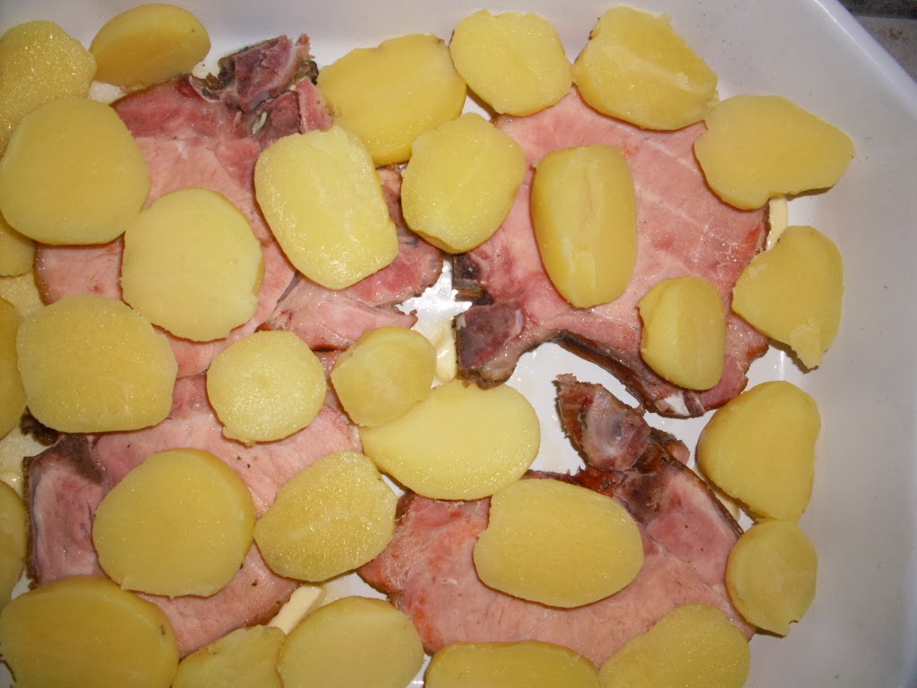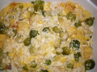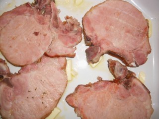 • В подходяща тавичка за печене, подреждам най-напред парченцата масло. Отгоре подреждам котлетите, после следват нарязаните картофи  и най-накрая – брюкселското зеле. Разбира се, тази подредба не е задължително да се спазва. Няма да се промени вкуса на ястието, ако нещо сте променили.