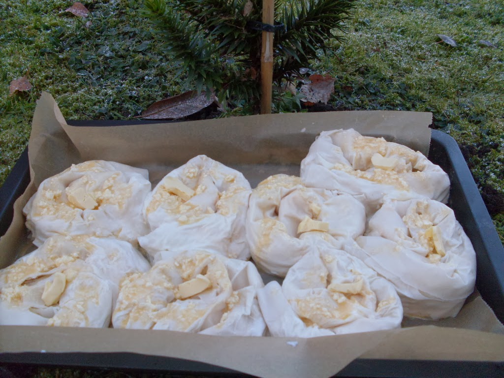 Ето, че наближават Коледните празници и в нашата къща започва да ухае на Коледа. Разбира се не може да има Коледа, без баница с късмети. Всяка година, когато се стигне до баницата с късмети, се започва едно ровене и чоплене в баницата, за да се открие късмет. Така, че тази година реших да направя малки банички с късмет във всяка една. Така съм сигурна, че всеки ще получи късмет и баницата ще бъде изядена. Трудно е с намирането на готови български кори за баница в чужбина, но не е невъзможно. Ако при вас никой не е пътувал скоро за България, и не е донесъл кори за баница, то посетете най-близкия турски магазин. Там винаги можете да си купите кори за баница, или за баклава. Аз имам късмета, че голямата ми дъщеря ми беше скоро на гости и разбира се, донесе кори за баница. Корите са на „Фамилия“ – 500 гр. Изброих листата – 16 бр. Достатъчно за 8 бр. малки банички.