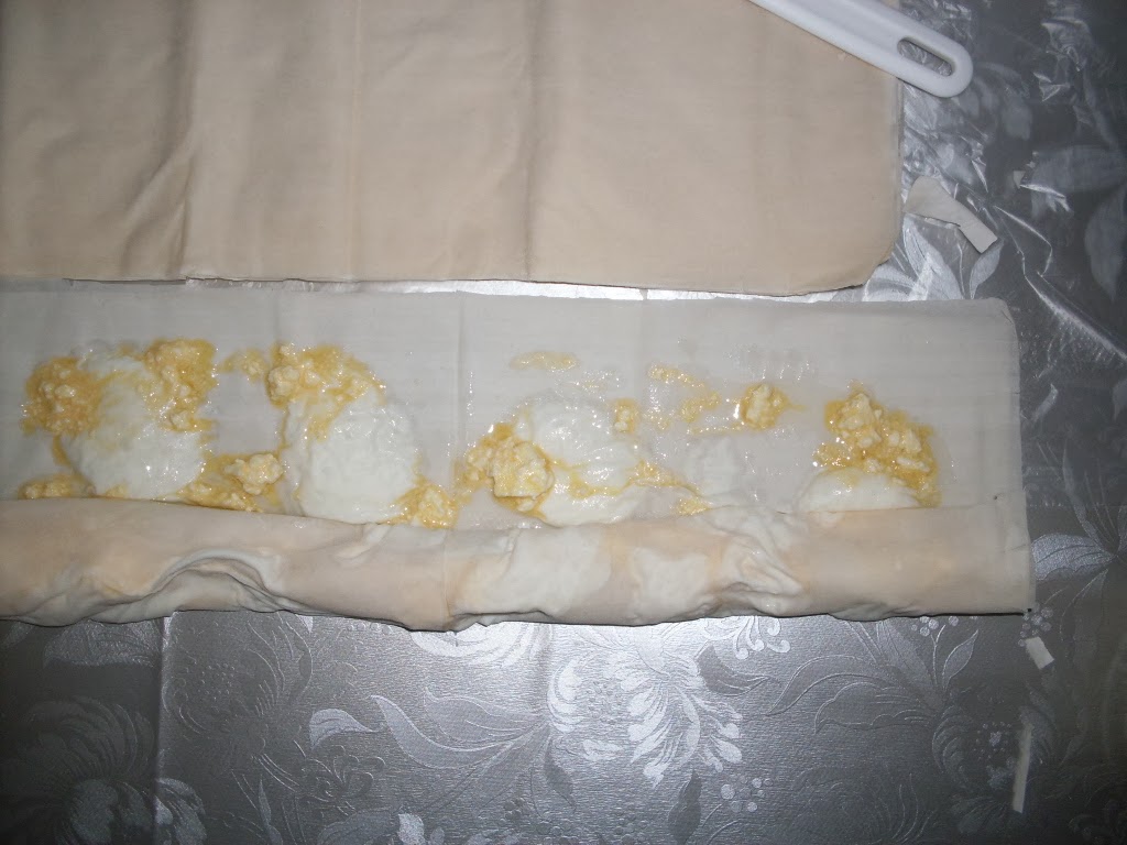 - Отделям си първата кора. Намазвам я със сместта от кисело мляко, около 2 с. л.. Отгоре постилам втората кора, която намазвам с 1 с. л. олио и със яйчената смес, около 3 с. л. Внимателно си разпределям плънката, за да може да ми стигне за всичките 8 банички. Като от яйчената смес оставям малко за намазване.