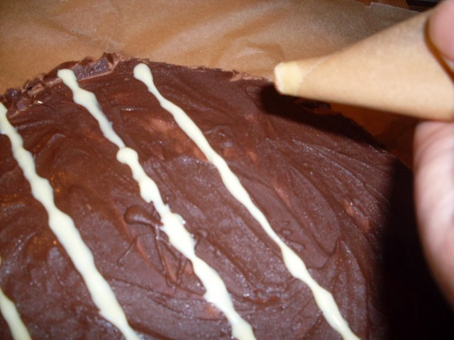 - Аз си направих фунийка от хартия за печене. Изсипах разтопения шоколад в тази фунийка и направих тези бели лини.