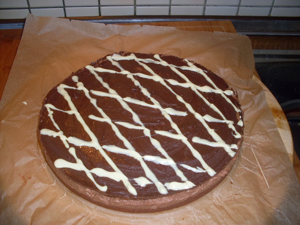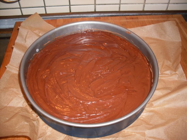 - След 2 часа или на другия ден, отново на водна баня, разтопявам още 200 гр. шоколад, с който покривам тортата. Ето тук имах проблем. Много бързо ми стегна шоколада при изливането върху тортата. Или пък аз бях много бавна и се наложи да изравнявам с лъжица. Следващият път ще работя още по-бързо. Излива се шоколадът и само с накланяне на формата за торта трябва да се разстеле навсякъде по повърхността на тортата.