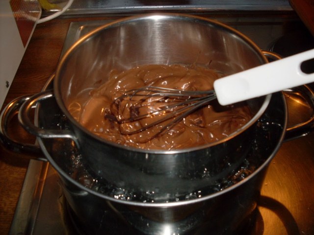 - Пресипвам шоколада в подходяща купа и при непрекъснато бъркане на шоколада, добавям лъжица след лъжица от крема.