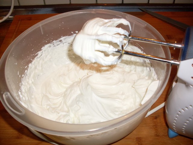 - В подходяща купа и с помощта на миксер разбивам на пухкав крем – сиренето или Quark с пудрата захар.