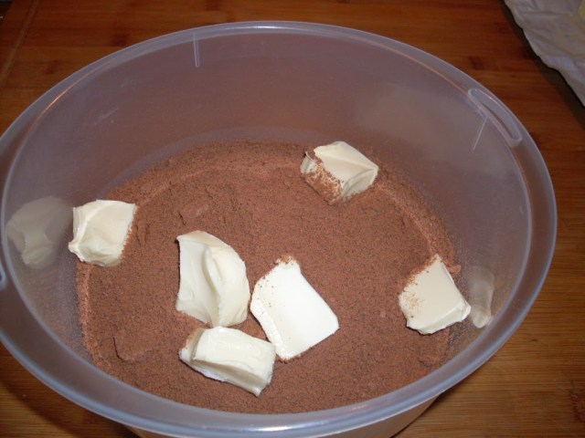 - Започвам да омесвам бисквитите и маслото, докато се получи нещо като тесто. Просто бисквитите поемат от маслото и като ги стиснете между пръстите те се слепват.