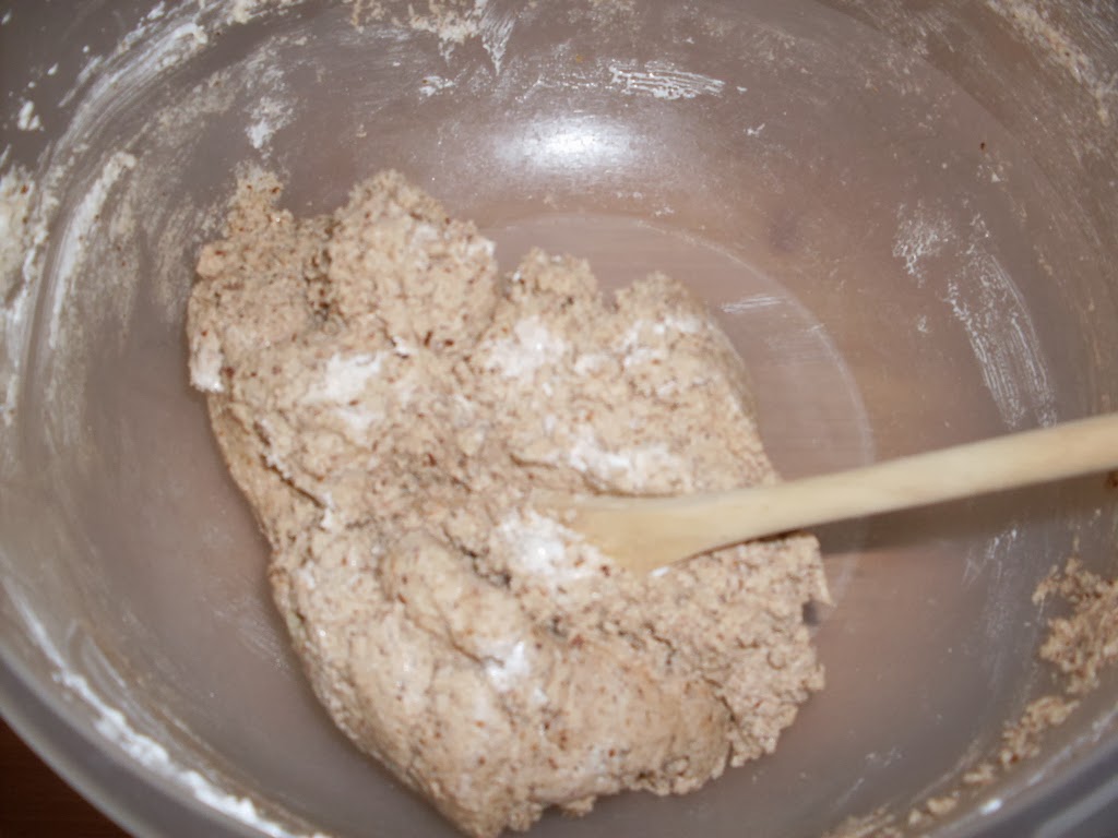 - Към останалата белтъчна смес, добавям смлените бадеми и канелата.