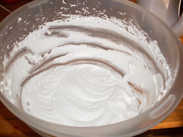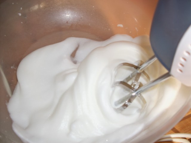 Винаги внимавам, когато чупя яйцата, да не попадне жълтък при белтъците. Това е важно, после при разбиването. Ако попадне жълтък, не се разбиват на сняг. Разбивам винаги с миксера. Проверявам, дали са готови, като обърна купата и те не се разсипват.