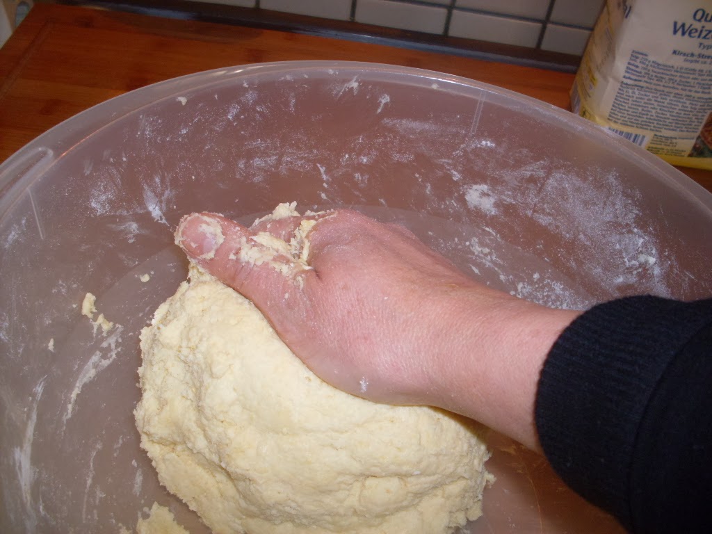 - В подходяща купа смесвам брашното, бакпулвера, маргарина, захарта, щипката сол и яйцата. Меся с ръце.