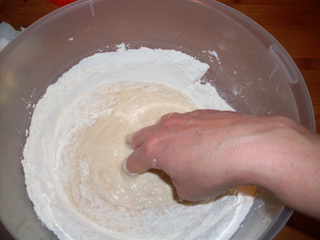 - Замесвам тестото от вечерта. В подходяща купа пресявам брашното и правя дупка в средата. В дупката изсипвам всички необходими продукти.