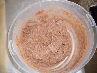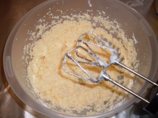 • Свинската мас трябва да постои известно време на стайна температура, за да омекне. Разбивам я много хубаво със захарта, към която съм добавила ванилията, за да се получи пухкав крем и тогава постепенно добавям едно по едно яйцата. Продължавам разбиването и добавям киселото мляко като предварително съм разтворила в него амонячната сода.