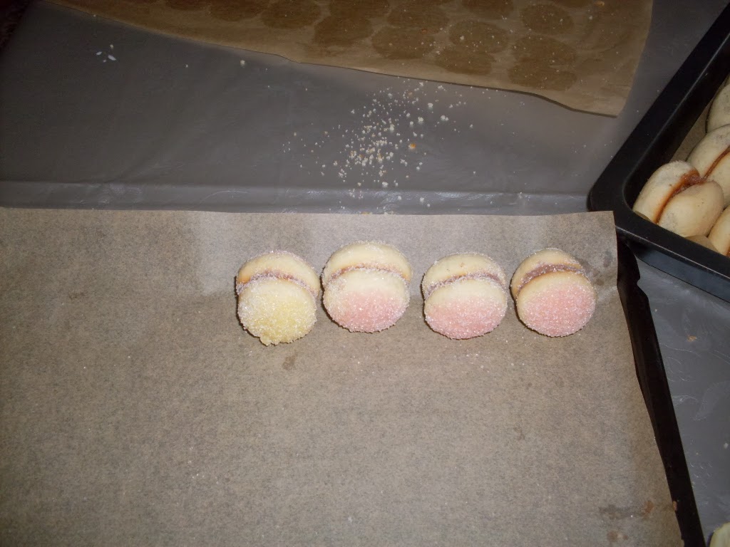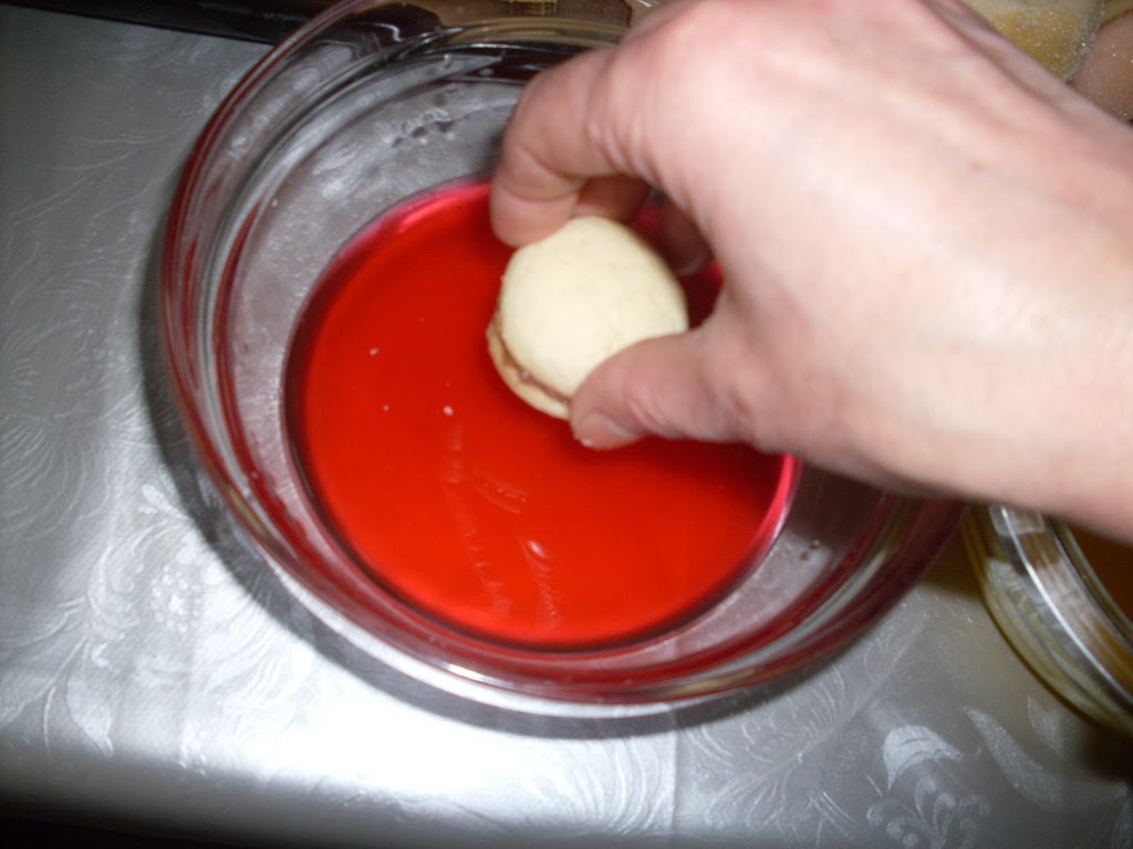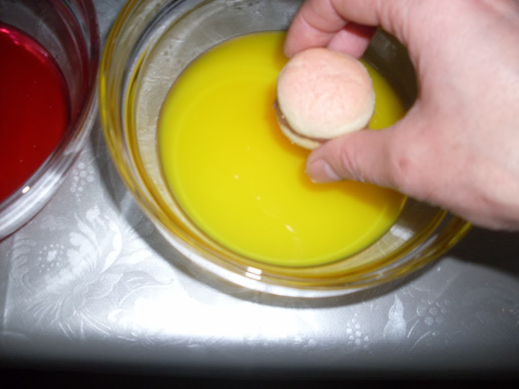 • Топя всяка сладка в червена боя, после обръщам и топя в жълта боя.  Топенето трябва да е за част от секундата, не задържайте сладката в течността, защото ще се напои и после става мека.