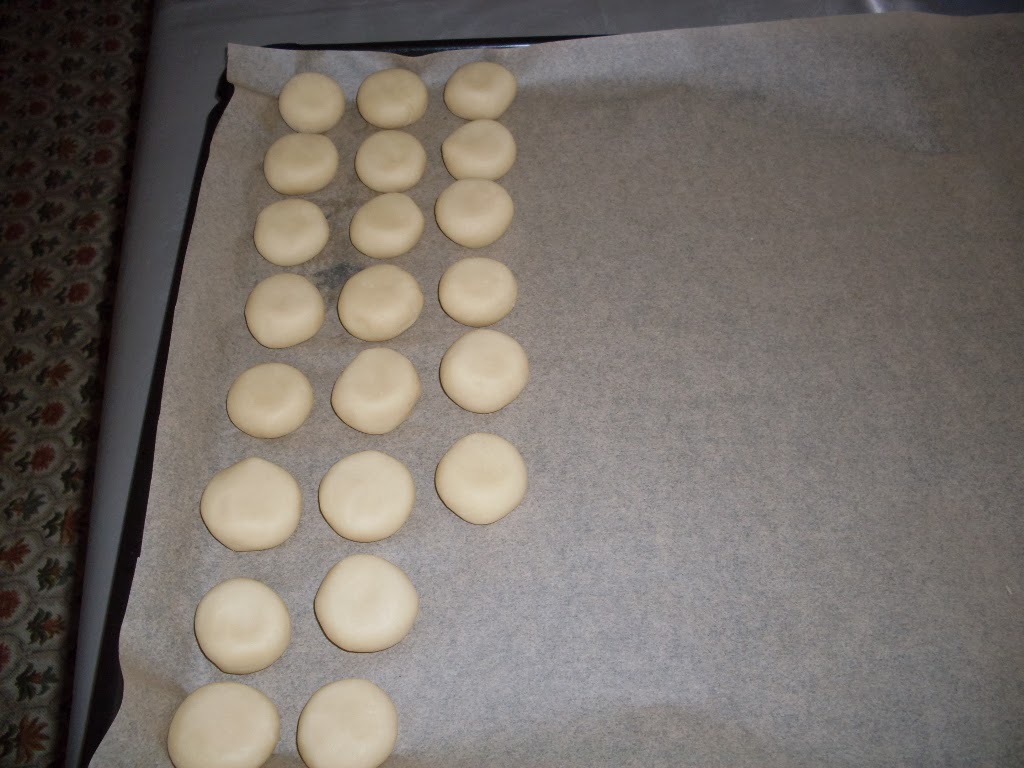 • Започвам оформянето на топченца с големината на орех. Не трябва да са по-големи, защото при печенето те удвояват обема  си. Подреждам в покрита с хартия за печене тавичка като оставям достатъчно разстояние между топченцата. Всяко топче притискам леко с пръсти.