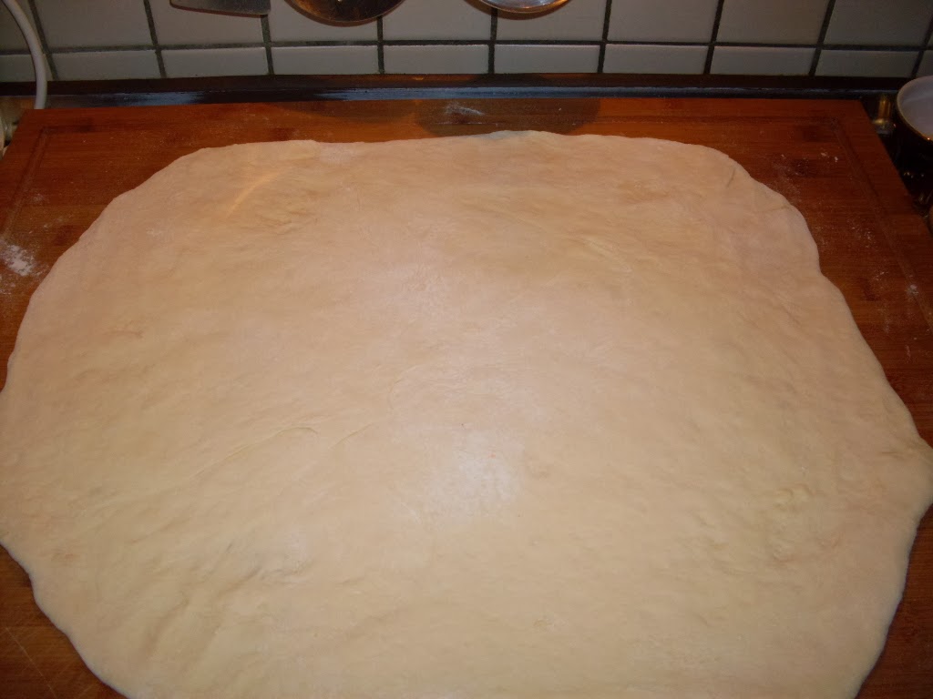 - Den Teig zu einem 50 x 45 cm großen Rechteck ausrollen.