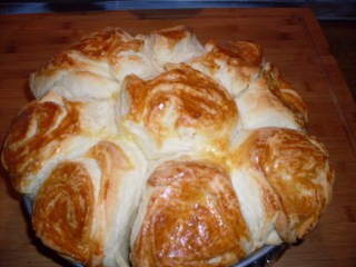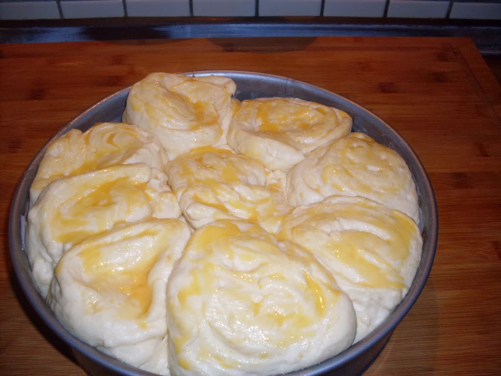 - Die Rolle in 9 Scheiben schneiden. Diese in Form geben, abdecken und 30 Minuten gehen lassen.