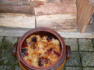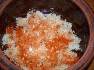 - На дъното на глинена тенджера, разстлах половината от киселото зеле.