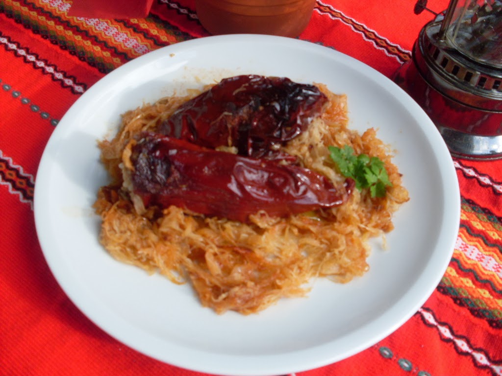 - Покрих чушките с останалото кисело зеле, поръсих отново с червен пипер, ситно нарязан чесън и малко сол.