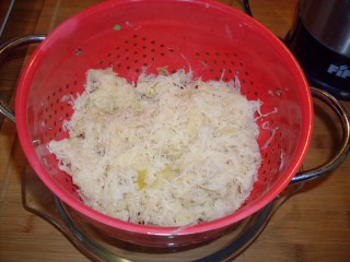 - Първото нещо, с което започнах е изцеждането на киселото зеле. Това го правя почти винаги когато готвя кисело зеле. Правя го откакто живях един зимен сезон в Банско. Там го научих. По оригиналната рецепта, киселото зеле се смила на блендер, но това което аз ползвам тук е толкова ситно нарязано, почти настъргано, че тази процедура отпада при мен.