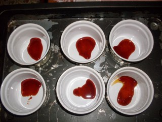 - Die Cremeflüssigkeit in die vorbereiteten Karamellschälchen bis knapp unter den Rand füllen.