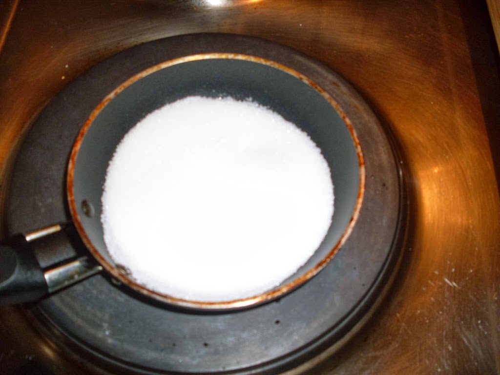 - Den Zucker für den Karamell bei mittlerer Hitze kochen lassen, bis ein haselnussbrauner Karamell entsteht.