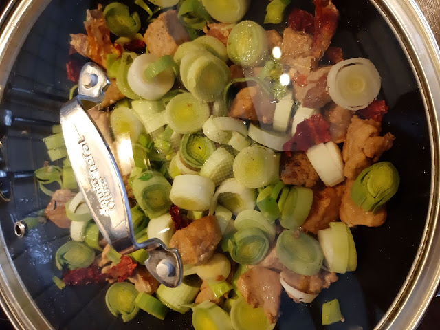 - Добавям надробената сушена чушка и празия или кромид лук към месото и си засичам още 20 минути. Време напълно достатъчно да се задуши лукът и да се до сготви месото.