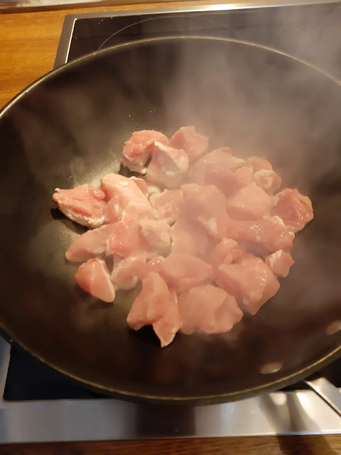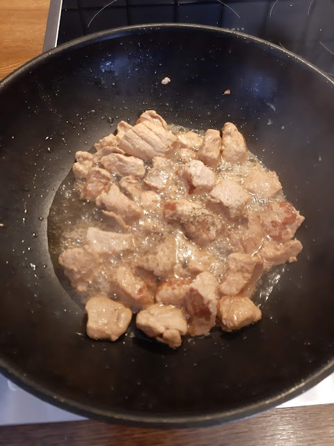 - Сипвам месото в уок тиган и загрявам на максимална степен, докато месото започне да се зачервява.