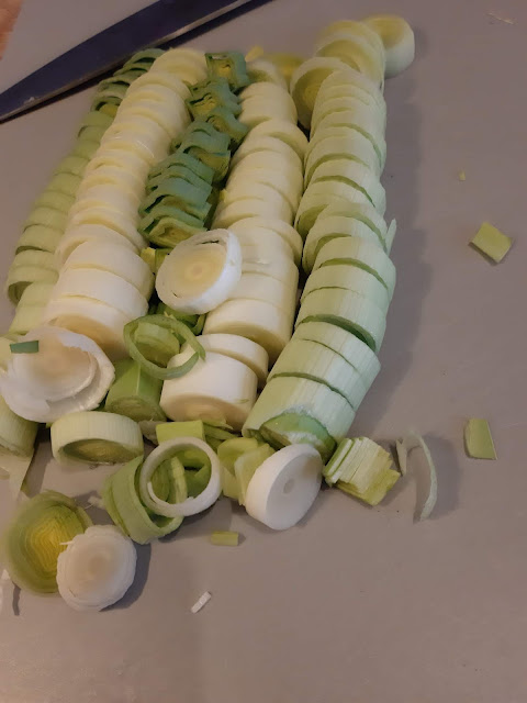 - През това време, обелвам лука и го нарязвам на лентички, когато използвам праз лук – на дебели кръгчета.