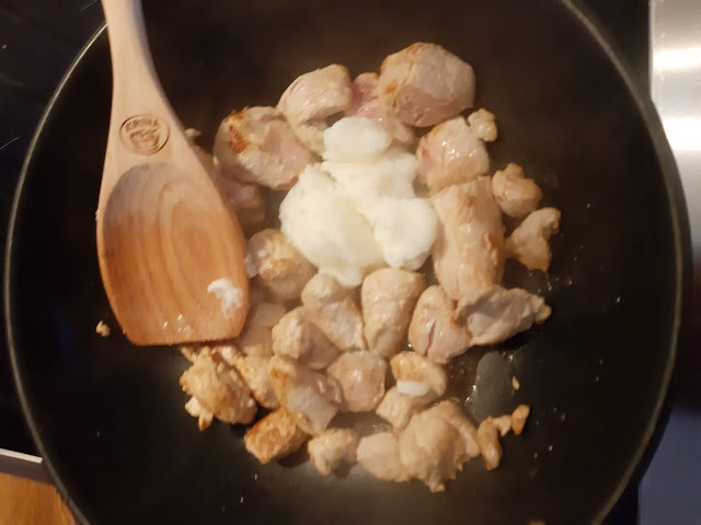 - Когато месото потъмнее до златисто от всички страни, добавям маста.