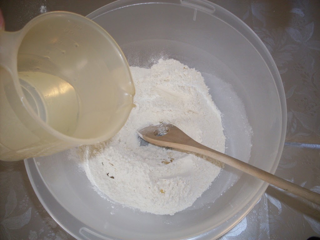 - В подходяща купа смесих брашното със солта. При постоянно бъркане, добавих постепенно водата и олиото.