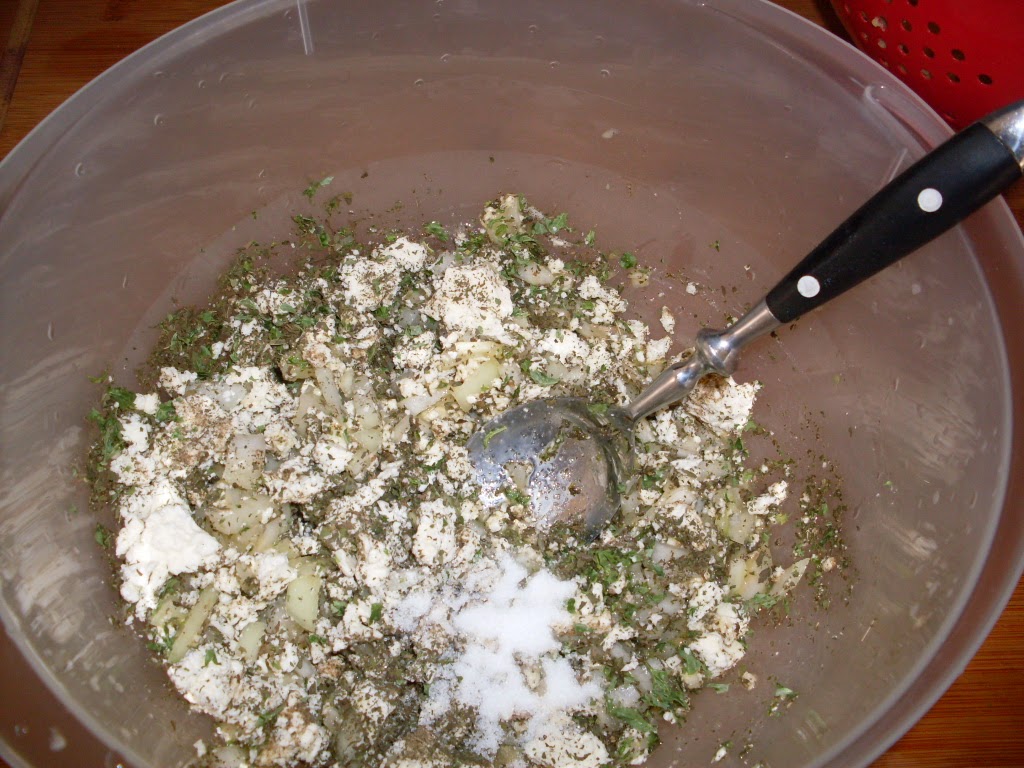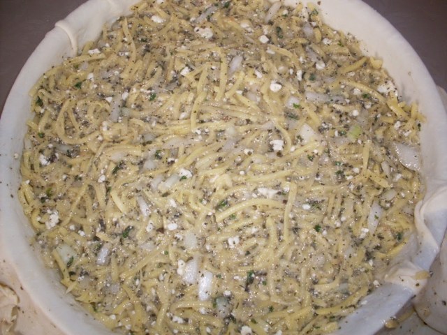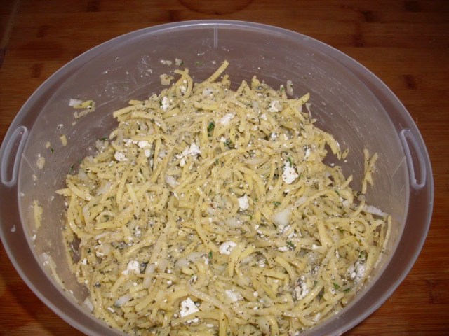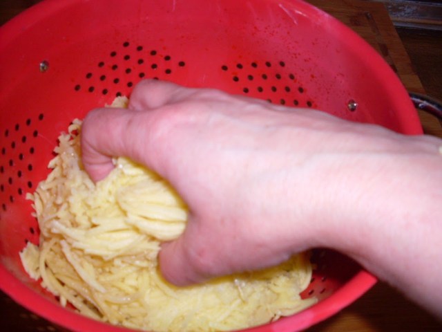 - През това време си приготвих плънката. Обелих картофите и ги настъргах на едро ренде.