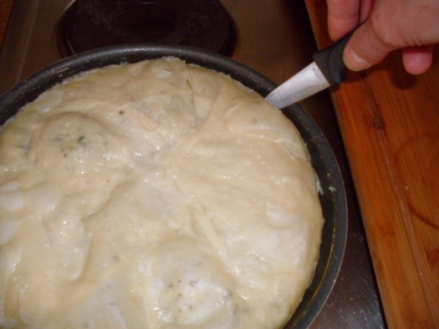 - Печенето продължи около 20 минути. Краищата на пататника добиха тъмно златист цвят. Така прецених, че е време да се обръща. С помощта на ножче, отлепих пататника от стените на тигана, за да може по-лесно да се обърне.