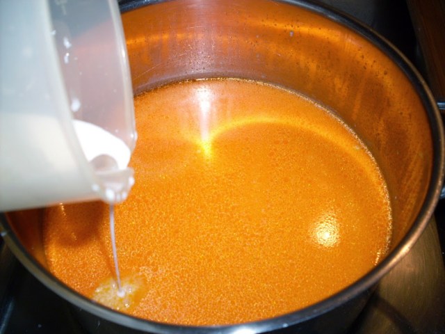 - След като е повряло с водата и солта, добавям студеното прясно мляко. Повече не похлупвам тенджерата, защото има вероятност много бързо да изкипи млякото.