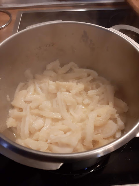 - Загрявам в тенджерка олиото и задушавам под капак, за около 15 мин. шкембето.