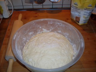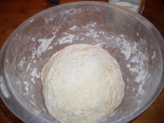 • В голяма купа пресях брашното, като винаги имам още допълнително брашно в готовност, ако случайно количеството в купата не е достатъчно. Направих дупка в средата и добавих в нея яйцата, разбити предварително, олиото, оцета, прясното мляко и разбира се втасалата мая. Бъркам всичко с дървена лъжица, като бъркам първо само в тази дупка и постепенно с лъжицата си взимам по малко от брашното. Бъркам докато тестото се залепи на топка върху лъжицата.