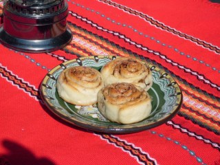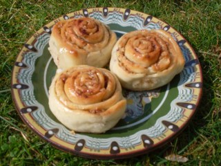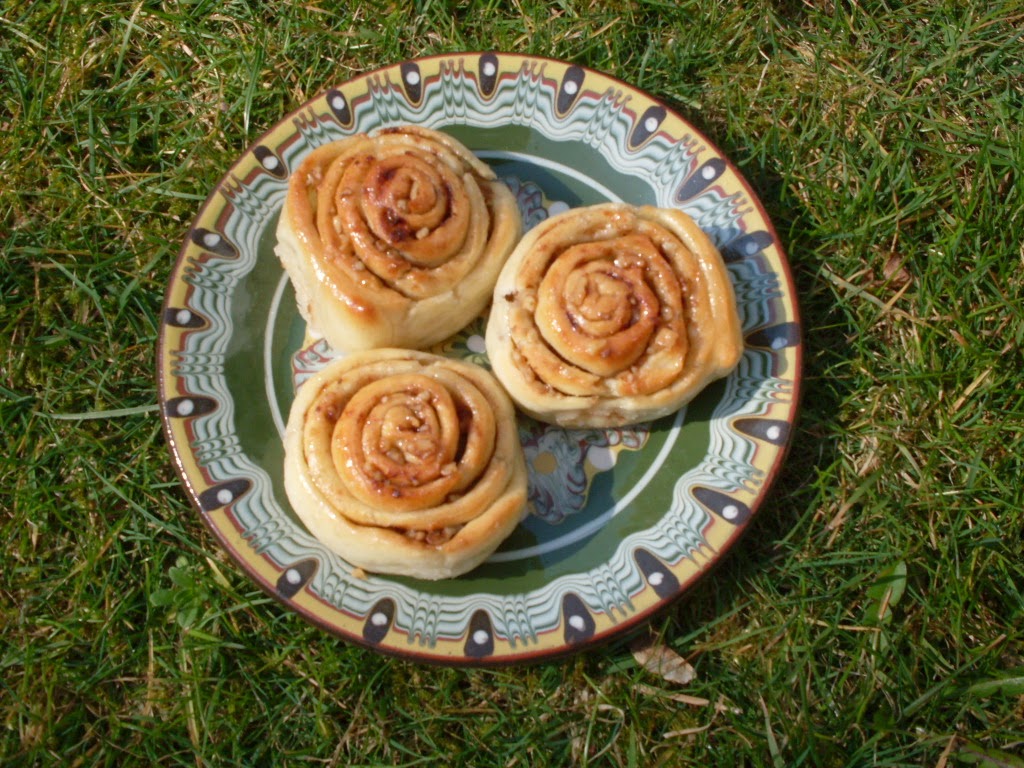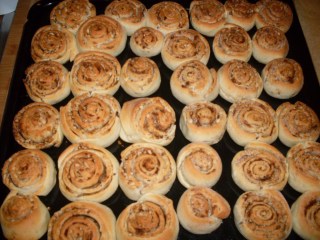 • Нарязвам  рулото на парчета с дебелина около 2 см. Подреждам парчетата в предварително намазнена тава, като ги обръщам с разреза нагоре и оставям достатаъчно място помежду им. Саралиите увеличават двойно обема си.