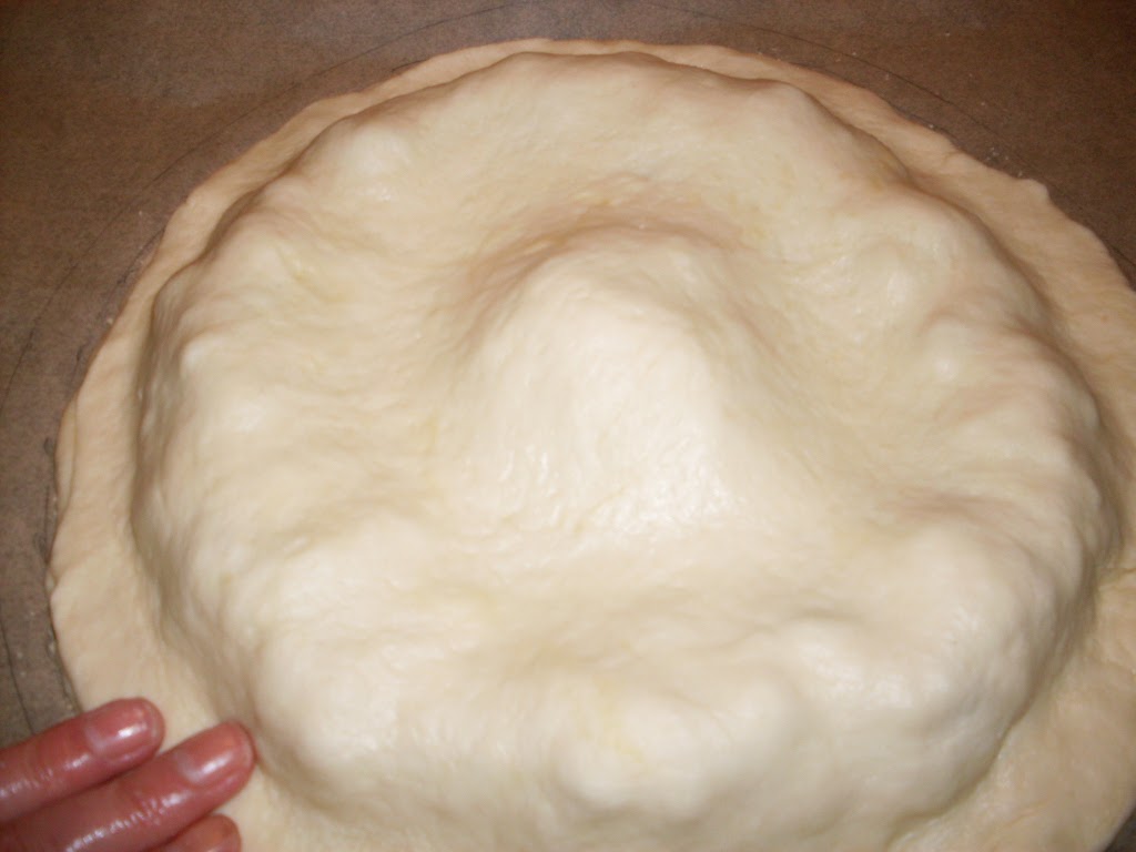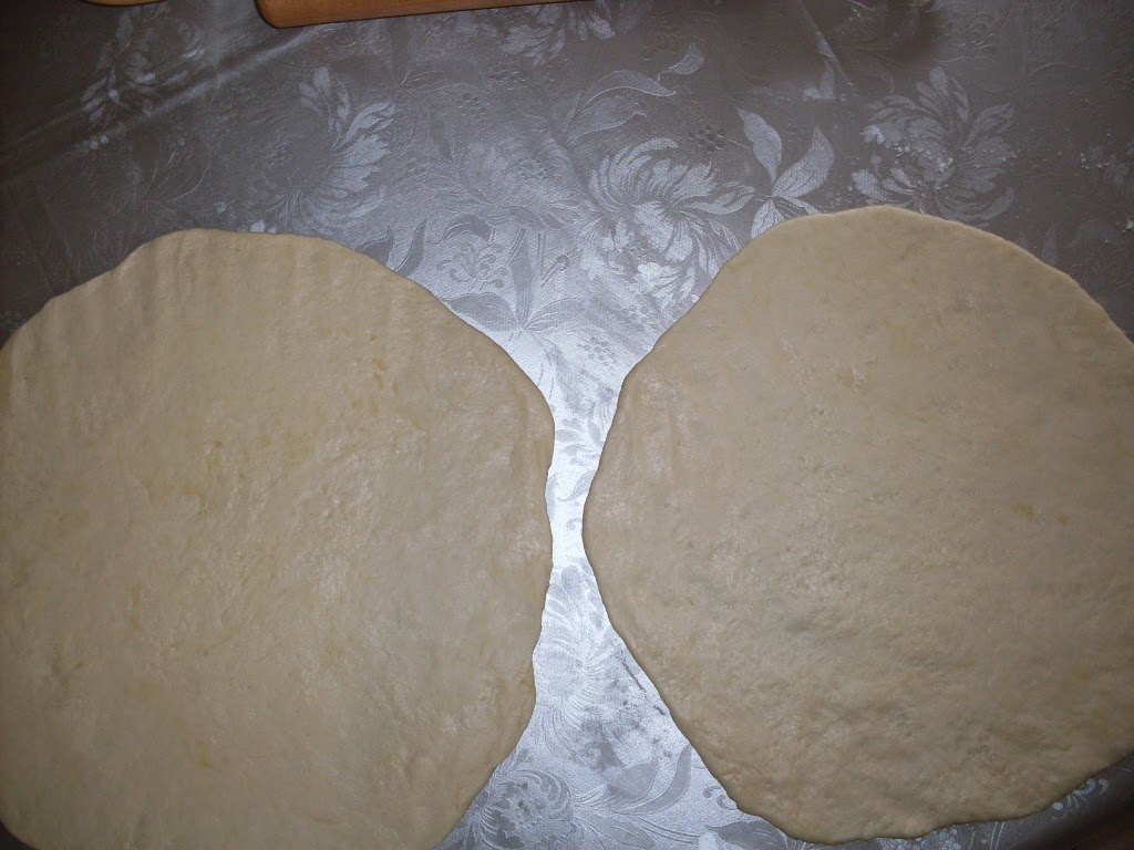- Разделих тестото на две равни части и от тях разточих две еднакви по големина кори с размер 30 см в диаметър и дебелина около 5 – 10 мм.