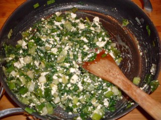 - Към изстиналата лучена смес, добавих разбитото яйце и натрошеното сирене.