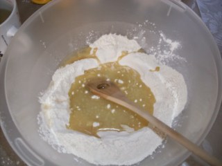 - Сега вече идва ред на тестото. В подходяща купа изсипах брашното и си направих по средата кладенче, в което изсипах сол, вино и олио.