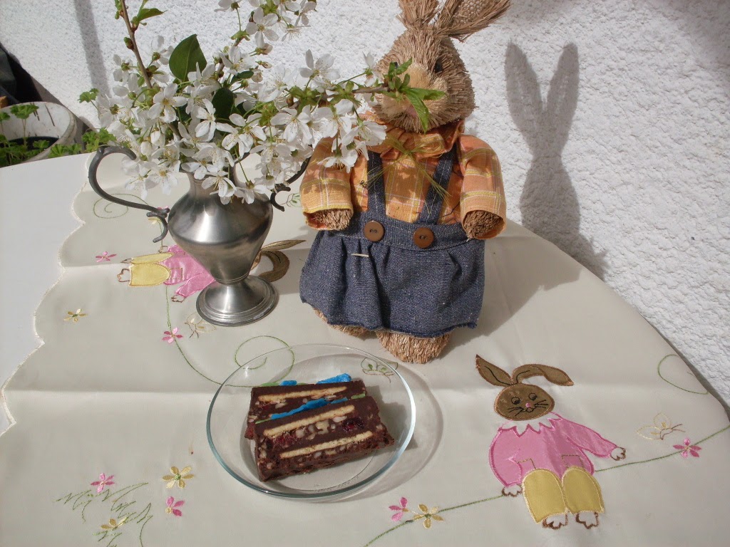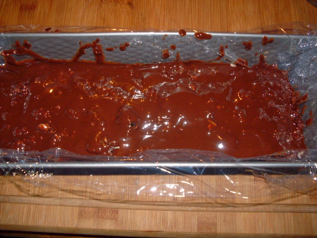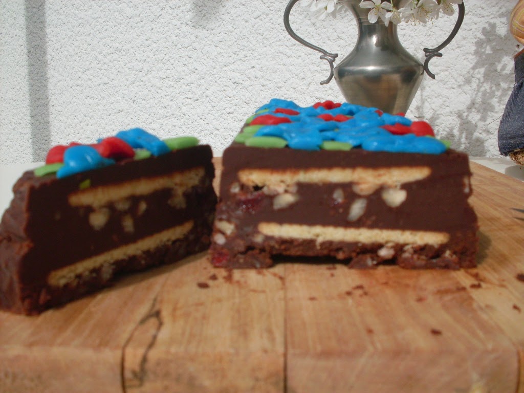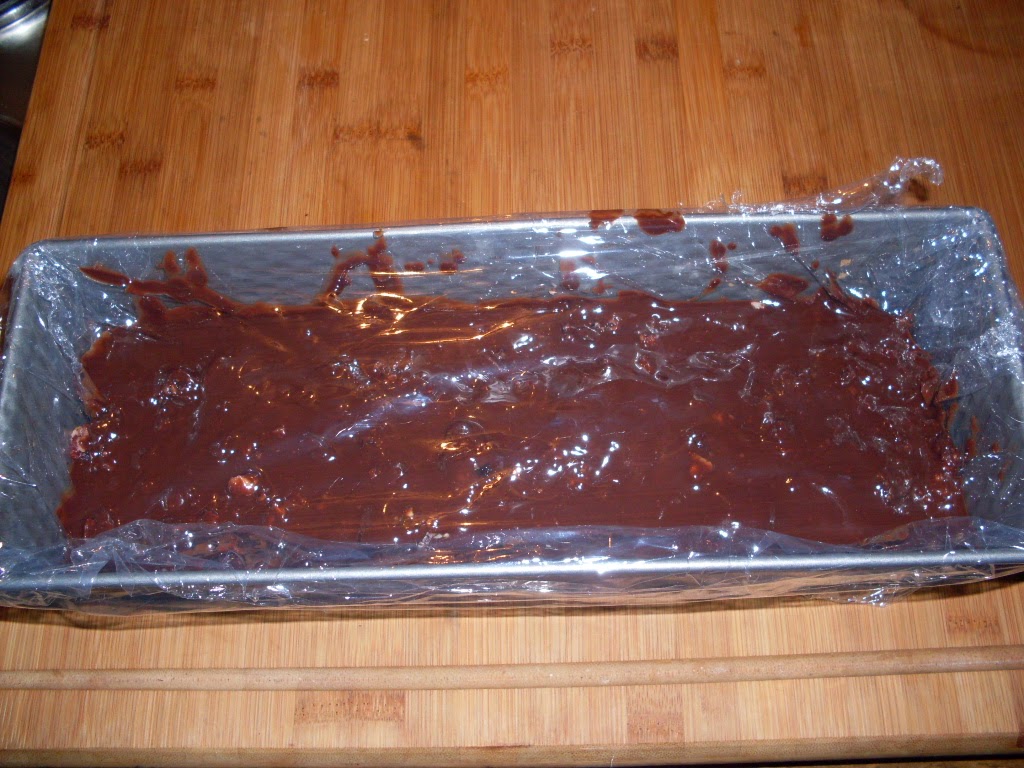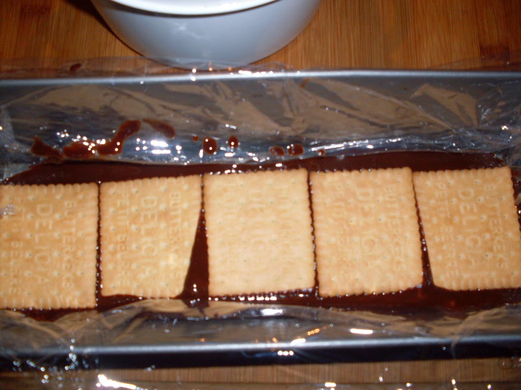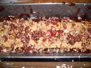 - 1 Drittel der Schokoladenmasse in die Kastenform geben, mit Lage Kekse bedecken und die Hälfte der Kirschen und Walnüsse darüber geben.